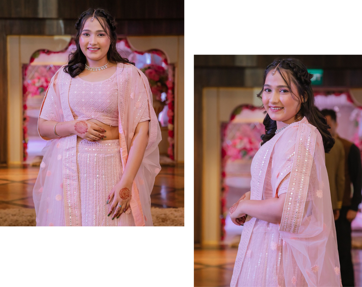 A pastel pink lehenga adorned with intricate threadwork and shimmering details, crafted for comfort and elegance.