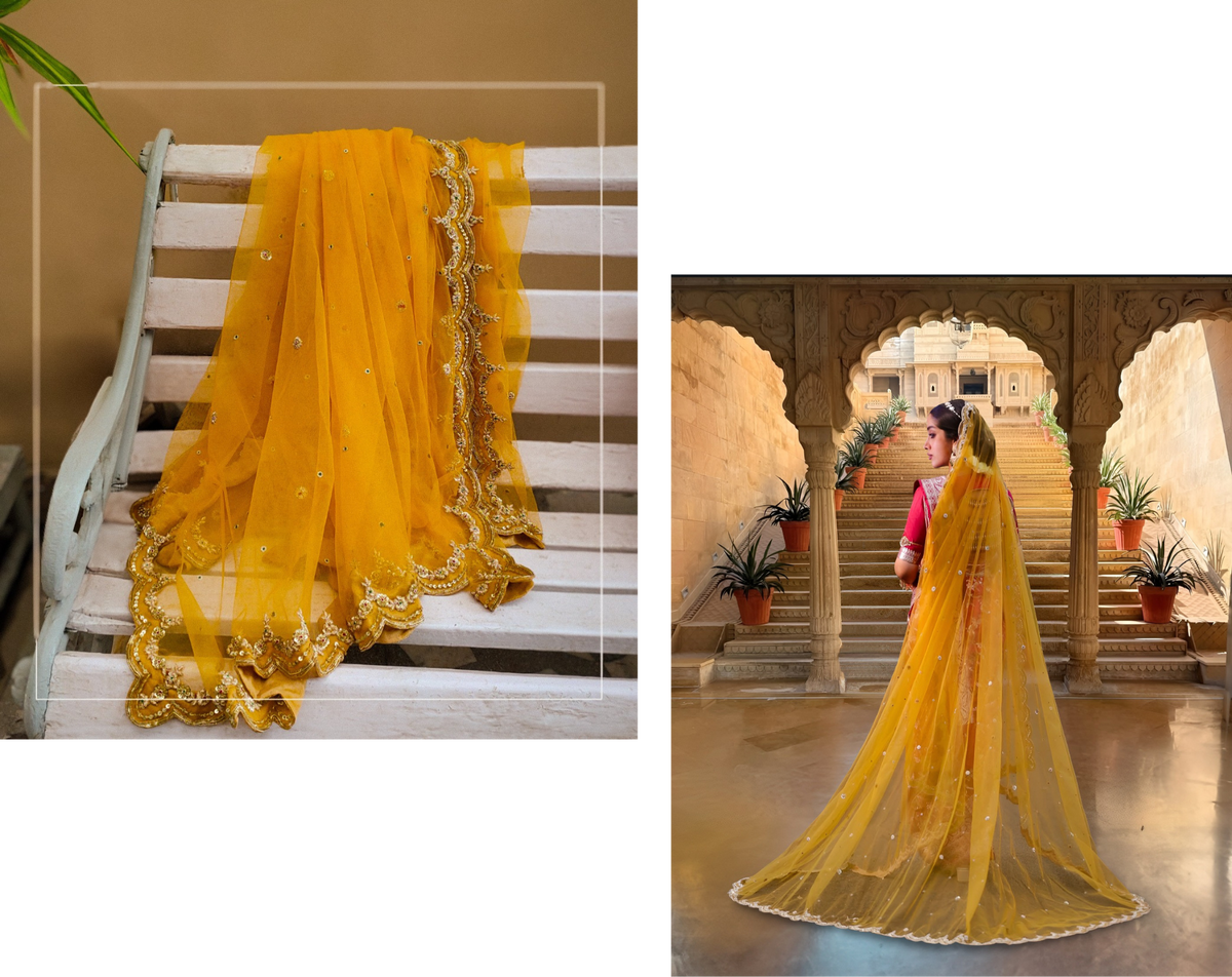 Intricately hand-embroidered in zardozi, this vibrant yellow bridal dupatta features scalloped edges with multicolour threadwork. Adorned with delicate floral motifs.