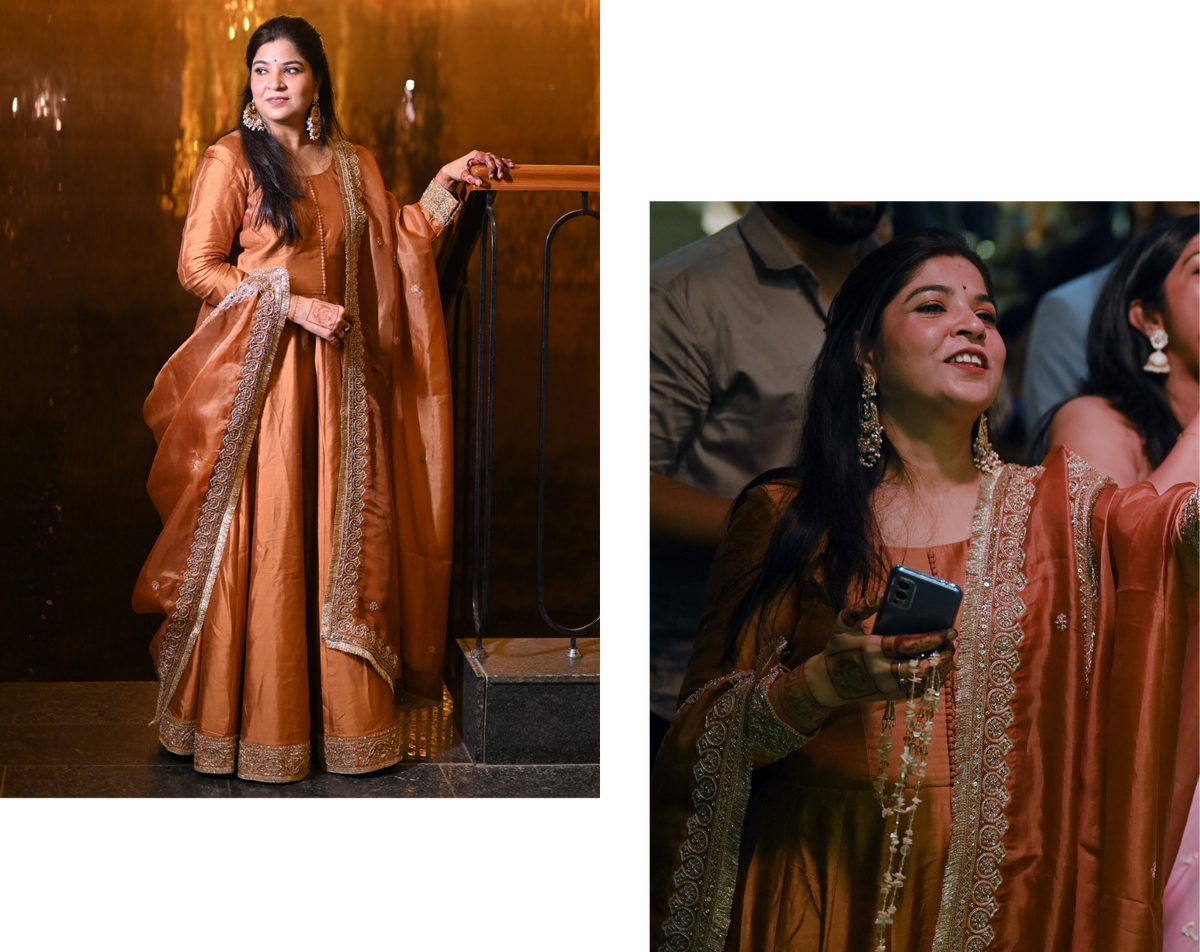 A stunning copper-gold Anarkali suit adorned with intricate hand zardozi work crafted to bring timeless elegance and festive warmth to every occasion.