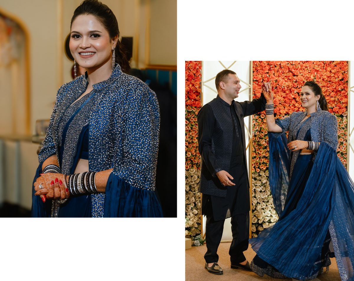 A timeless navy organza saree paired with a beautifully hand-embroidered shrug.